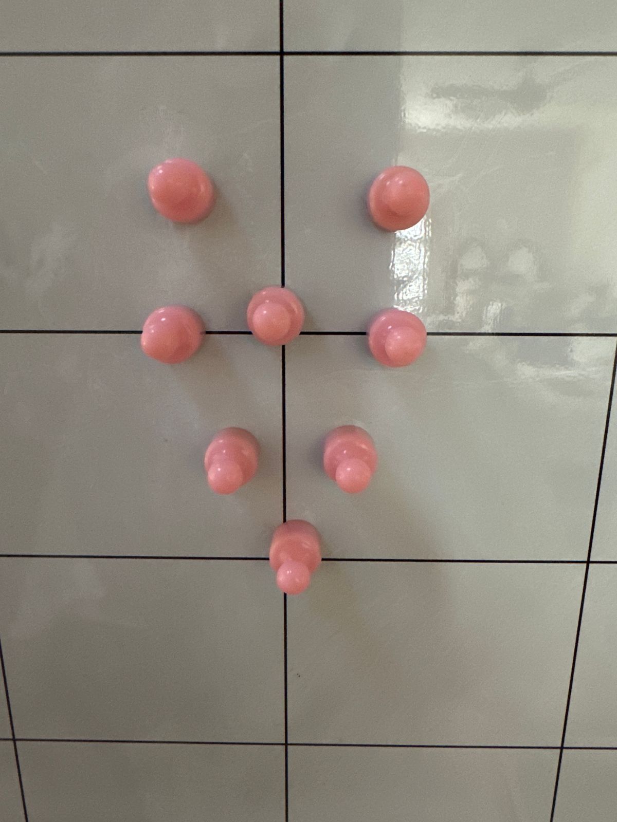 Pink memo board magnets signify priority. They suspend and highlight documents requiring impending action. A time of reckoning. Lying in wait on the office white board, the refrigerator or range hood at home, metal cabinetry in the shed or workshop, these little maroon pins ambush and pin down important documents that need to linger long enough to attract attention and be acted upon.